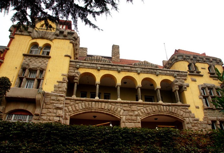 青島總督府,氣勢宏偉,建筑面積為4083平方米,高度為30米,厚達(dá)60多厘米的外墻以黃色為基調(diào),局部以花崗巖石料作裝飾,石面加工粗樸,正門墻飾以淡綠色、淡灰色花崗巖石,頂部石料雕以美麗的圖案,于粗放之中見精巧。米紅色筒瓦、藍(lán)色魚鱗瓦、綠色牛舌瓦鋪設(shè)的樓頂,使大樓更加精美別致。1957年環(huán)繞迎賓館修建了圍墻形成了占地面積達(dá)86000多平方米的庭院,院內(nèi)遍植果樹和多種觀賞植物。