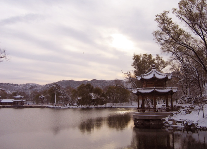 閣的東北部有水門與山莊水系相通,閣前池水清澈,人在閣前特定位置向池中望去,只見池中有一彎新月,隨波晃動,而天空卻是艷陽高照。原來這是造園家在池南的假山上,開出一個半圓形如上弦月的縫隙,利用光線,在水中形成下弦月的倒影,構成“日月同輝”的奇特景觀。水池南岸是一座造型別致的假山,怪石嶙峋,氣勢雄渾。假山占地約800平方米,用石3279立方米,由漿石和雞骨石等堆疊而成。假山石洞,前后各有兩門相通,結構也頗具匠心。洞內山石遮掩,可分廳、堂、窗、孔、穴等,洞壁用雞骨石鑲嵌,幽深曲折。有幾個大小不等的窗孔,透進幽幽的光線,使洞中的峭壁怪石若隱若現。山上橫嶺縱峰,溝橋崗壑,各自爭奇。有棒槌山、羅漢山、雙塔山等十大名山的縮影,更有“十八學士登瀛洲”的造型,還有仿米芾“寶晉齋”的園林布局。文津閣東為碑亭,四角攢尖頂,上覆黃琉璃瓦,內豎石碑一座,通高5.34米,碑正面鐫刻著乾隆題《文津閣記》,其余三面刻有乾隆作的3首詩。文津閣庭院,由粉墻圍繞,是山莊的園中之園。這組建筑,坐北朝南,依次布置著門殿、假山、水池、藏書樓、花臺、曲池、山石、月門。東側有碑亭和值房3間。閣前池水清澈,澄泓見底,水草叢生。池南假山呈半月形環抱池沼,版權所有山東聊城聊之旅國際旅行社有限公司,轉載必究!拱峙摟閣,疊石大多仿承德十大景堆砌,與山莊西山渾為一體。假山上有賞月的月臺,其西有趣亭(已不存)。假山上有磴道,下有洞府,入門進閣,必經此洞。石洞曲折幽邃,洞頂有一曲形石孔,光線漏射到池水中,恰如一彎新月,每當麗日當頭,水池中卻素月高懸,“抬頭看日,低頭觀月”,日月同輝,景觀絕妙,又為山莊一絕。