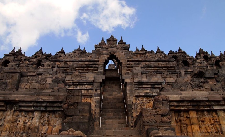 婆羅浮屠位于印度尼西亞,大約于公元750年至850年間,由當時統治爪哇島的夏連特拉王朝統治者興建。“婆羅浮屠”這個名字的意思很可能來自梵語"Vihara Buddha Ur",意思就是“山頂的佛寺”。后來因為火山爆發,使這佛塔群下沉、并隱蓋于茂密的熱帶叢林中近千年,直到19世紀初才被清理出來。與中國的長城、印度的泰姬陵、柬埔寨的吳哥窟并稱為古代東方四大奇跡。
