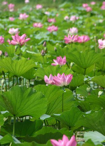 每至盛夏,微山湖數百里湖面花團錦簇,荷花飄香。百畝、千畝、萬畝、十萬畝,大小片不等,接天連壤,一派壯觀景色。