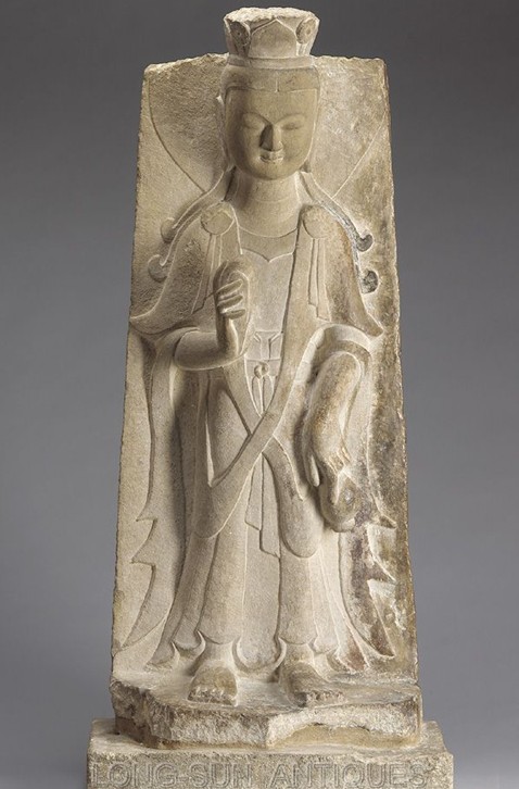 石像高3.9米,腰圍2米,手長40厘米,背北面南,立于50厘米高的石雕蓮花座上。石像刻線明顯,披巾搭胸,細(xì)腰束帶。雕線棱角分明,刀法洗煉,在個(gè)體石像中甚為罕見,為我國古代石雕珍品。現(xiàn)為省級(jí)重點(diǎn)文物保護(hù)單位。