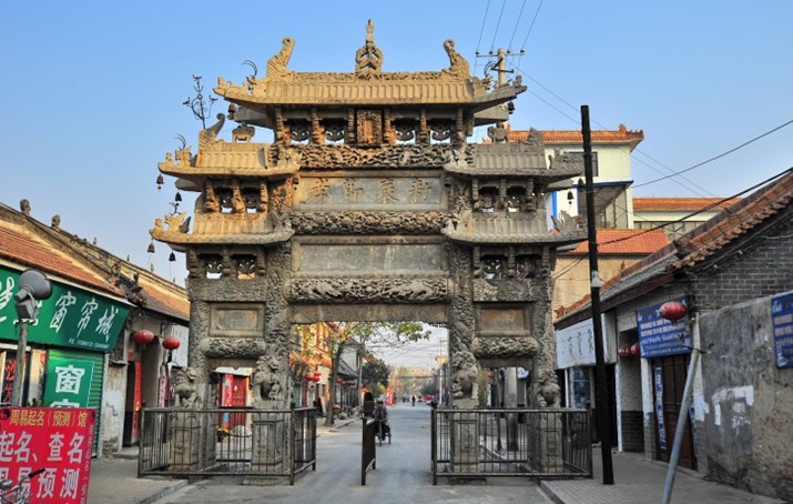 百壽坊俗稱朱家牌坊,位于單縣城內(nèi)勝利北街,乃清乾隆三十年(1765年)為翰林院孔目贈儒林郎朱叔琪妻孔氏而建,因雕有一百個不同書體的壽字而得名。坊以青色魚子狀石灰?guī)r構成,通高l3米、寬8米,四柱三間三層樓閣式建筑。其獨特之處是:坊座雕有8頭矯健雄獅昂首遠望,8條出水蚊龍繞柱回舞,額枋上飾滿盛開牡丹,與正間上下額枋祥云間翩翩飛舞的5只透雕仙鶴、次間上額枋浮雕的相對翱翔之鸞鳳構成了具有無窮魅力之藝術佳作,寓意福壽萬年、富貴無媲或喜上眉梢。