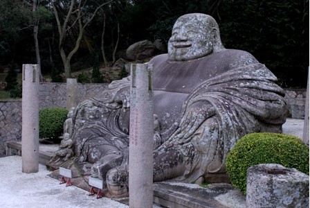 彌勒巖山麓,有一高大石佛盤膝而坐,這就是名聞遐邇的彌勒石雕造像。石佛像始鑿于元至正年(公元1341年),至明洪武年(公元1368年)竣工,高6.8米,寬8.9米,由整塊花崗巖就地琢成,天然妙相,袒胸露腹,兩耳垂肩,笑態可掬,觀者可以忘憂。經國家文物局認定,該石佛為全國最大的立體石刻彌勒佛像,已納入國家級文物保護單位。