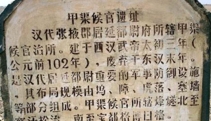 甲渠候官遺址俗稱破城子,位于額濟(jì)納旗南24公里,納林、伊肯河之間的戈壁灘上。為漢代居延都尉西部防線甲渠塞之長——甲渠候駐所。發(fā)掘前,遺址大部分為砂礫掩沒。往西300米,南北排列“一”字形烽燧和雙重塞墻遺跡。障塞為一土坯方堡,基方23.3平方米,厚4—4.5米,殘高4.6米,結(jié)構(gòu)為由三層土坯夾一層芨芨草筑成,草層間距45厘米。