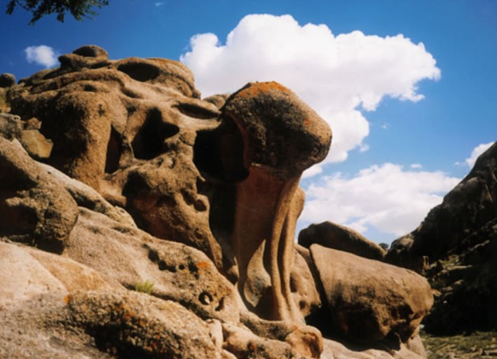 觀山猶海,哈不茨蓋怪石林(神石溝)一群率真又爽快的朋友相邀,一個(gè)富于蠱惑而神奇的召喚,一個(gè)有關(guān)山石鬼魅空靈的話題,一個(gè)久遠(yuǎn)的神往,于是,在陣雨迷離的清晨,我們結(jié)伴向著諾爾公“神石溝”出發(fā)了。 一路,漠原底色的焦黃在濃重陰云的籠罩下,淺淺雨韻的滋潤(rùn)里,陡然生出一些新綠的況味。這時(shí)一個(gè)關(guān)于生命的感悟,關(guān)于自然與人的和諧審美,沿著那條鋪向遠(yuǎn)天緞帶般的路面。