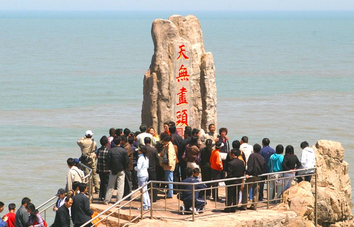 1984年10月23日,胡耀邦視察成山頭,見眼前海天一片。大海浩翰,峭壁巍然,巨浪飛雪,氣勢恢宏壯觀,感仿秦漢古韻,不禁有感而發,揮筆手書“心潮澎湃”、“天盡頭”七個字,“天盡頭”三字立碑于此,碑高180cm,碑寬85cm,碑厚35cm。