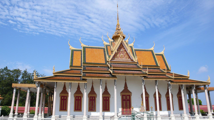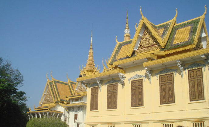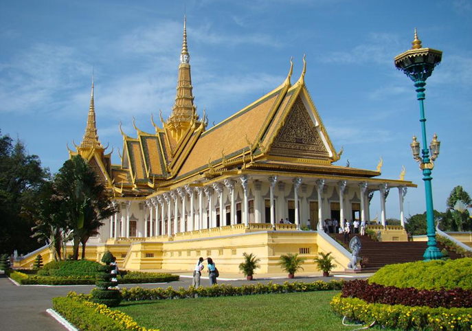 金邊皇宮(Royal Palace),也稱四臂灣大皇宮,建造于1866-1870年 。坐落于金邊東面,面對湄公河、洞里薩河、巴沙河交匯而形成的四臂灣,屬于典型的高棉式建筑。王宮為長方形,長435米,寬402米,外有城墻,里面共有20余座建筑物。建筑極富高棉傳統(tǒng)風(fēng)格和宗教色彩,多為黃、白兩色,黃色代表佛教,白色代表婆羅門教,所以看上去金燦燦的。