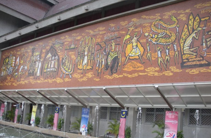 古典式馬來建筑的墻面上裝飾著兩幅巨大壁畫,長35.1米,高 6米,左側(cè)是表現(xiàn)馬來西亞各種手工藝品制造的全過程,右側(cè)是從12世紀起至1957年馬來西亞獨立的各個歷史時期的重要場面。