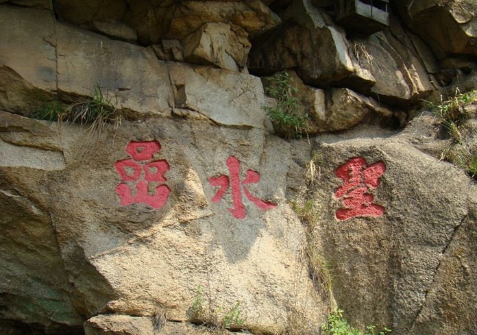 玉陽(yáng)洞西側(cè)下方有一天然石洞〔俗稱“濕洞”〕,洞口像張開的巨大蛤蟆嘴。洞壁巖石交合處,東西各有一個(gè)石縫,圣水從石縫中流出。據(jù)《寧海州志》記載:“洞中東西二流,自石罅出,激激如線,二源一停一注,十二年一周,東西相更代,故曰‘圣水’。且天將雨,則漏天滴滴,濺人衣裙,版權(quán)所有山東聊城聊之旅國(guó)際旅行社有限公司,轉(zhuǎn)載必究!晴則否,山下人以此卜陰晴屢驗(yàn)。”金朝散大夫 有文云“水不見發(fā)源,但嵌嵌之下,裂石而出,激激如線,味甘冷且清,春秋不變,水旱不知,蛙蠅之屬未嘗產(chǎn)焉,此亦異也。”欄版上題銘:“大安三年(1211年)二月日高 生說囗”。