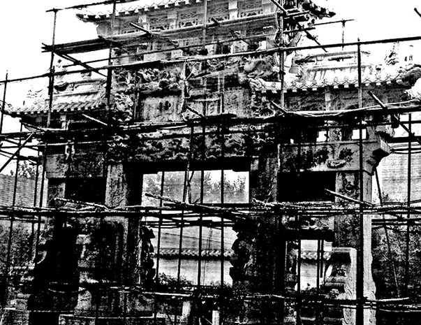 獨具匠心的藝人對不同物象分別采用淺浮雕、高浮雕、透雕、圓雕等多種藝術(shù)手法,刀法精巧,圖像秀麗。在不同部位刻了不同的內(nèi)容,在兩根中柱的東西兩面,分四組雕刻了精美瀟灑的八仙,維妙維肖,栩栩如生,有呼之欲出的效果;其內(nèi)側(cè)刻有兩尊門神,手持金瓜,相對而立;中柱底座的內(nèi)側(cè),刻有反映“耕、讀、漁、樵”社會生活四幅風(fēng)俗畫,形象生動,富有生活情趣。整個坊頂有12條垂脊,每條垂脊角的上、中、下部都刻有1只昂首眺望的龍頭,共36只。在3條正脊兩端都有1只尾巴上翹的龍,口銜正脊,相對升騰。特別是在坊頂正中位置刻有1只背負(fù)寶瓶的麒麟,方向與坊頂平行,矯健昂首,凌空欲飛。