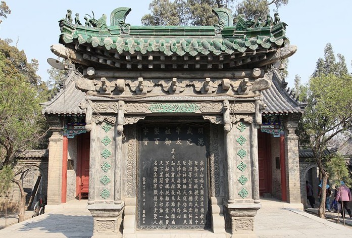 大門樓高十余米,建筑面積三十六平方米,兩邊有八字墻,兩個門,門面通寬三十幾米,甚為壯觀。是單檐歇山式磚石結(jié)構(gòu)。門洞為拱卷式,外部完全仿制木結(jié)構(gòu),檐下斗拱、垂珠、掛磚,均為磚雕。門樓上呈現(xiàn)的龍鳳等吉祥之物的磚雕,形體全用花卉圖案湊成,素有“似獸非獸、有眼無珠、遠(yuǎn)看是獸,近看是花”之說。橫枋上還鑲嵌有磚雕伊斯蘭教焚香用的爐瓶及經(jīng)卷等圖案。大門正面匾額是石刻“真教寺”,背面橫額磚雕阿文“麥斯吉德”(音譯),其意為“禮拜真主的地方”,俗稱“主的天房”。