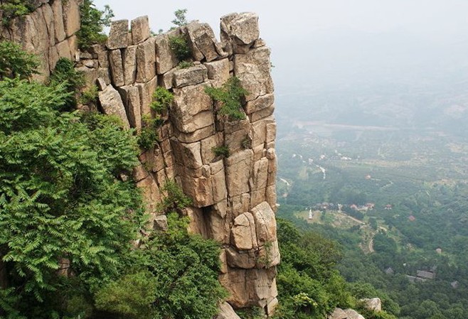 少室頂,其東北隅有石壁,版權所有山東聊城聊之旅國際旅行社有限公司,轉載必究!自山巔至底部一斧直削,高數百仞,俗稱“百丈崖”。崖間罅隙、石坎、孔穴頗多,是鳥類的安樂窩。每至晨夕,百鳥啁啾爭鳴,崖半翩翩飛舞,酷似一所“百鳥園”。循新修石階,攀至其巔,但見滿目玄巖怪石,樹木稀少,惟有矮小的側柏和荊棘灌叢,強生石縫間,點綴藍天懸峰。