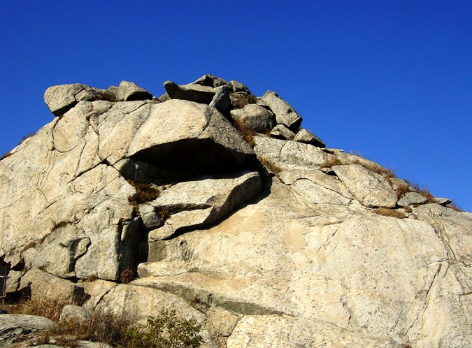 韓信點將臺:位于崮山頂峰北部,面向山谷,臺面平整如刀削,鄰近懸崖之處,一道石壁突兀而起,臺下是懸崖峭壁,右側有數級臺階,也是天然形成。