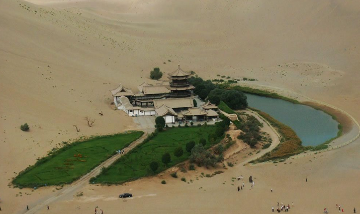 月牙泉位于敦煌市西南5公里處,是一處神奇的漫漫沙漠中的湖水奇觀。鳴沙山下,泉水形成一湖,在沙丘環(huán)抱之中,酷似一彎新月而得名月牙泉。月牙泉,古稱沙井,俗名藥泉,泉邊蘆葦叢生,水中魚兒自在,胡楊沙棗綠樹成蔭,羅布麻、枸杞等藥用植物豐茂,亭臺樓榭古香古色,春夏季節(jié)百花盛開,夏秋季節(jié)梨果飄香。自漢朝起即為“敦煌八景”之一,得名“月泉曉徹”。月牙泉南北長近100米,東西寬約25米,泉水東深西淺,最深處約5米,彎曲如新月,因而得名。一灣清泉,漣漪縈回,碧如翡翠。