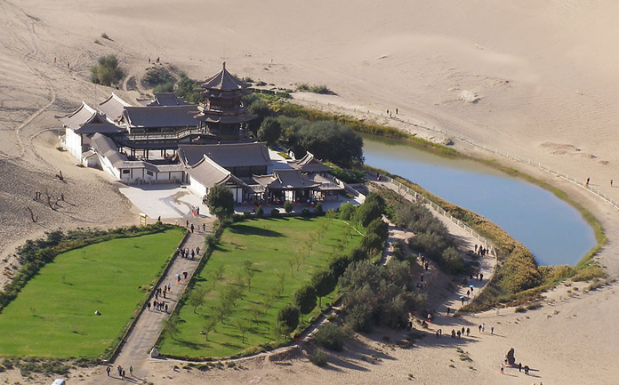 五十年代測量,月牙泉東西長218米,中斷最寬處54米,平均水深5米,最深處7米余。南岸原有廟宇百余間,但十年動(dòng)亂中焚毀,農(nóng)業(yè)大躍進(jìn)時(shí)又抽水灌田導(dǎo)致池面嚴(yán)重縮小。近年修復(fù)古建、掏泉疏水、治沙綠化,才有今天面貌。臺灣易經(jīng)研究專家張淵量博士1993年游河西時(shí)根據(jù)易經(jīng)、易理考證認(rèn)定月牙泉即王母娘娘蟠桃盛會之瑤池也,信否隨意。