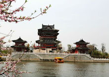 桃花島——桃源春曉 陳庵之南是桃花島,島名切合《桃花扇》劇名。“隱龍”、“十勝”二橋將島岸相連。島中選種不同種類的桃花品種,春時各色桃花爛漫,桃花澗中水流淙淙,加之島邊太湖石堆砌的假山,徜徉其中,似身處幽靜而自然的世外桃源。這里廣植桃樹,春風綠岸之時,桃紅復含宿雨,花光更染晨旭,一大片明艷的桃林景色,營造出現代城市的一角桃花源。站在這里回望城河,河面開闊,聊城聊之旅旅行社有限公司版權所有,轉載必究!天光水影,恰喜一條小船在波心撒網,讓人想起唐人張志和《漁歌子》中的煙波畫意。