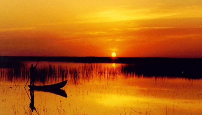 遠看湖面,黑壓壓的一片,像是塘上殘留的荷蒂。走近了才看清,原來都是鳥兒。黑色的是野鴨,白色的是白鶴,雜色的竟是鴛鴦。其實種類還多著呢,連當地人也說多得叫不出名字來。鳥兒看見人走近了,前面的就往后邊飛去,如是一撥又一撥地飛飛停停,像跟你開著一個永遠的玩笑,也跟你保持著一定的距離,這時你會認同書上所說的:這是在全球荒漠和半荒漠地區中,為數不多的鳥類遷徙地和繁殖地。最難忘的還是烏梁素海的日落。只見夕陽映在湖面上,變成一條金色的柱子,從遠方地平線的湖面上延伸而來,九十度筆直地豎在你的跟前。只有偶爾飛起的野鴨或鳥兒掠過金柱,生就帶出一筆畫意。當夕陽完全西沉了,這時飛鳥的啁啁聒噪聲,像是在惜別黃昏,再見夕陽。