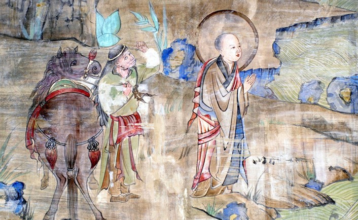 5窟前室東西壁北側(cè)的兩幅《文殊變》、《普賢變》(東壁《文殊變》已脫落)中的文殊、普賢、青獅、白象、山水、團(tuán)云相對稱。其繪畫手法則粗獷大筆,與2窟細(xì)致入微的線描手法迥然不同。西壁南側(cè)為《八塔變》。塔下婆羅樹左右對稱。有趣的是,塔右側(cè)婆羅樹上倒掛著4只頑皮可愛的猴子在井中撈月。畫中套畫,景中套景,版權(quán)所有山東聊城聊之旅國際旅行社有限公司,轉(zhuǎn)載必究!構(gòu)思巧妙。兩壁下沿大規(guī)模供養(yǎng)人畫像與題名接銜,是考證西夏人開窟繪畫的直接依據(jù)。