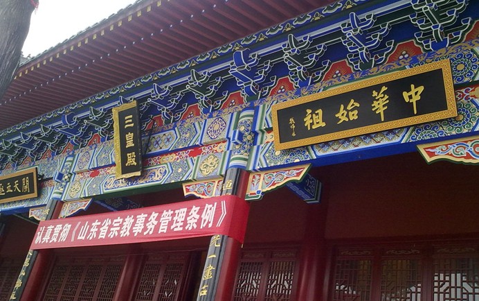 全廟坊、亭、房、廊等建筑,嚴格安排在縱貫南北的主軸線兩側,布局對稱而緊湊,疏密相宜而有致;主體建筑依次排列在主軸線上,統領全局,雄渾端莊。當游人沿天水城內大街西行來到伏羲路時,遠遠就可望見一座掩映在綠萌之中的大牌坊,那便是伏羲廟前大門。這牌坊,巍然矗立于高二米、寬六點五米、長十七點六米的臺基之上。版權所有山東聊城聊之旅國際旅行社有限公司,轉載必究!臺基圍以磚砌勾欄,東、西、南三面均有垂帶式踏跺。拾級而上,可見牌坊面寬三間,單檐歇山頂,正脊兩端 飾有鴟尾螭獸;檐下斗拱為四攢七鋪作,六抄單拱,兩柱頭有轉角斗拱,均系精雕細鏤的上乘佳作。對于研究明代木構建筑很有參考價值。牌坊正中,懸有巨幅匾額,上書"開天明道"四個大字,為清乾隆湟中觀察史楊應舉手跡,筆力遒勁,瀟灑流暢,向來為游人所稱道。原先,伏羲廟門前東西兩側,還有橫跨大街的兩座牌坊,面向相,上楣分別題有"開物成務"、"繼天立",與大門匾額之"開天明道"一樣,都是對伏羲功德的極端頌詞。廟門南面,與大門牌坊隔街相望,有一座建于清代乾隆年間的戲樓,三間寬,兩層樓高,飛檐挑角,造型精巧,深受群眾喜愛。天水市政府對伏羲廟的改建和保護非常重視,目前準備在天水伏羲廣場建一尊99米高的的伏羲像。