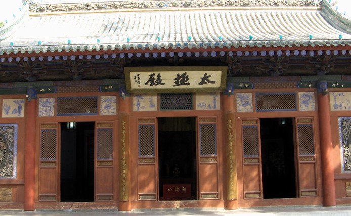 先天殿在中院月臺的當間部位。此殿異常宏大壯觀。看著它踞高凌空、莊重威嚴的風格,游人往往嘖嘖贊嘆。這座大殿通高二十六點七米,縱深十三點五米,面寬七間,通長二十六點四米,是一座典型的明代風格建筑。殿頂上覆琉璃簡瓦,正脊兩端亦施龍吻,垂脊、戧脊 施螭獸仙人。正脊中有橋亭火珠,脊面乃飾纏枝牡丹。其奇巧精致,耐人尋味。這座宮殿的門窗雕飾工藝,堪為上選藝術品,往往吸引不少游人,版權所有山東聊城聊之旅國際旅行社有限公司,轉載必究!由于為其精美的工藝所傾倒,而總是流連忘返。這些門窗,全系木質結構,上面鏤刻雕飾有金錢、艾葉、仙鶴、孔雀、蝙蝠、蝴蝶,還有二龍戲珠、鹿宿松下等圖案,花紋細密,栩栩如生,有很高的欣賞價值。入大殿內,即見一中心方柱似的神龕,這便是供奉伏羲塑像的地方。完高五米有余,上根懸掛"文明肇啟"匾額,系清代嘉慶年間秦州牧王賜均所書。匾文是對伏羲始創八卦、教民克愚的巨大功績的高度贊頌。