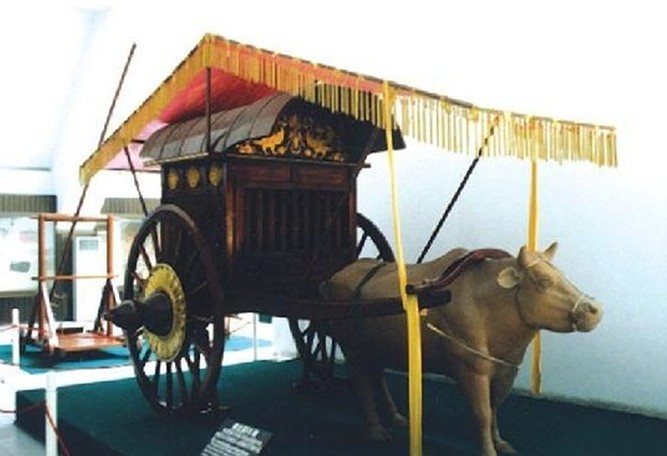 展廳內陳列的第一輛車為商代車,是依據河南省安陽的郭家莊殷墟出土的資料復原的,同時還展出了商車發掘現場的模型。版權所有山東聊城聊之旅國際旅行社有限公司,轉載必究!繼之是兩周雙馬駕挽的曲衡車;春秋戰車則是依據臨淄后李春秋殉車馬復原的四馬挽車,馬頭上的飾件精美多樣,有嵌絡、銅串飾,也有銅泡式,均依據出土實物而復原的。為了使觀眾進一步了解車戰情況,專門配有車戰圖和車戰講解。