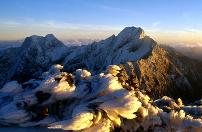主峰玉山海拔3997米,為臺灣第一高峰。因常年積雪,遠望如玉,南、西、北四座高峰,人稱“五岳朝天”。玉山之美,美在它的奇峰。主峰挺拔、高峻,山容山勢具王者之尊。站在山巔向四周眺望;北面雪山、南湖大山、中央尖山;南面關山、北大武山,遍覽無遺;清晰可數。真有“會當凌絕頂,一覽眾山小”之感,俯視全省,群山如丘,河溪如帶;遠望太平洋,回顧臺灣海峽,只見無窮蔚藍空碧,仿佛天地相接,直覺浩氣充溢心胸。