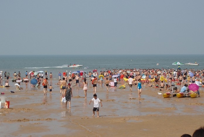 沙灘下帳篷、太陽傘鱗次櫛比,海水中泳衣五顏六色,猶如給大海鑲上了一道美麗的花環。