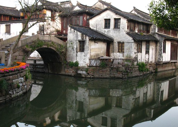 史載于1086年的古鎮周莊,位于上海、蘇州、杭州之間。鎮為澤國,四面環水,咫尺往來,皆須舟楫。全鎮依河成街,橋街相連,深宅大院,重脊高檐,河埠廊坊,過街騎樓,穿竹石欄,臨河水閣,一派古樸幽靜,是江南典型的小橋流水人家。