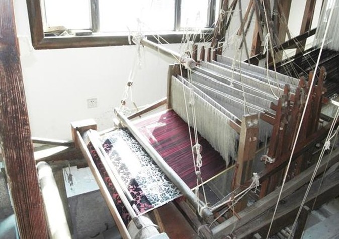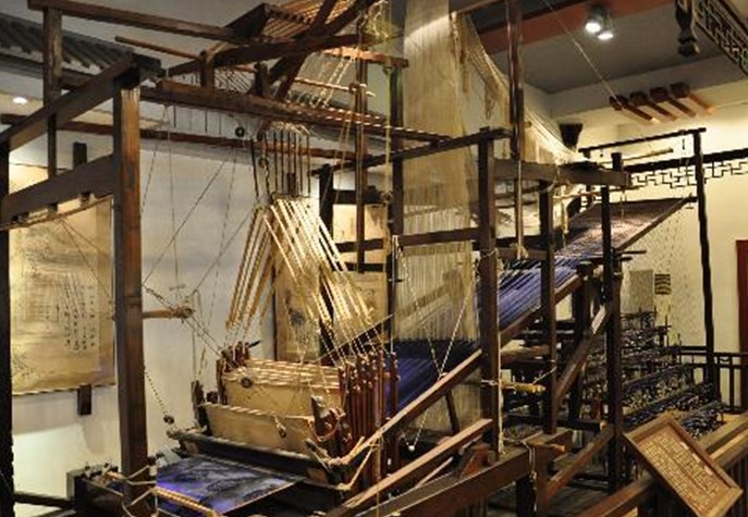 沿絲路右側(cè),一組沙漠駝隊的浮雕,形象生動,古樸渾厚,與半墻有機結(jié)合,顯示了漢唐以來絲綢之路的風光特色。“古代館”的絲綢陳列,以其珍貴的絲綢文物及模型、圖片,展示了新石器時代晚期絲綢的起源,直到明清時期絲綢生產(chǎn)的沿革,它是一部濃縮了的中國古代絲綢史。絲綢離不開蠶桑,“蠶桑居”是根據(jù)近代農(nóng)家養(yǎng)蠶載桑的真實情景和桑園再造。跨進“織造坊”,又是另一番景象,在這里可以見到各種類型的古代織機和傳統(tǒng)工藝的手工操作表演,猶如身臨明清時期蘇州絲綢業(yè)“東北半城,萬戶機聲”的繁榮境地??椗畟兩碇叛b作現(xiàn)場表演。天鵝絨織機、漳緞織機、云錦織機、腳踏繅絲機、纟革絲機,都在進行運轉(zhuǎn)操作,古代云錦、彩經(jīng)絨、纟革絲等著名絲綢品種的織造過程,在這里都得到充分演示。有一種工藝獨具特色,讓人看后舍不得離開,一塊巨大的石元寶下的凹槽里,放著纏有絲織品的木棍,一位藝人將兩腳踏在石元寶下的兩個突出部,然后晃動石元寶,通過碾壓,使絲綢變得柔軟平挺。光澤可鑒。這就是江南絲織工藝一絕的絲綢砑光處理。