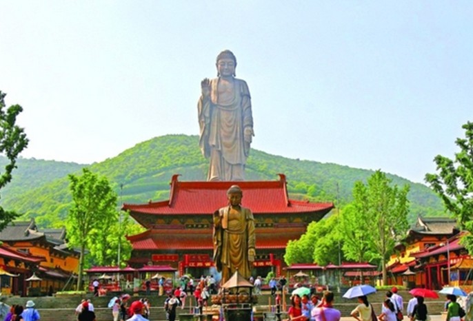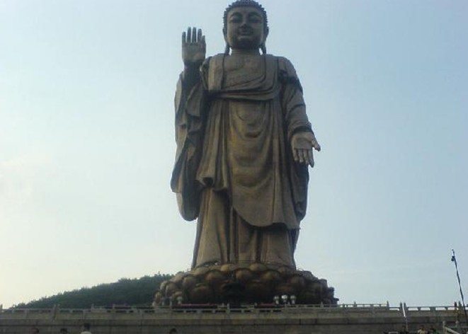 靈山的歷史可追溯到1000多年前的唐代,相傳玄奘西天取經歸來,游歷東南到此,來到現在的小靈山,見“層巒叢翠”,景色非凡,大為贊賞,曰“無殊西竺國靈鷲之勝也”!于是就給此山起名小靈山。印度的靈鷲山,就是釋迦牟尼得道成佛的地方,是著名的佛教圣地,并囑大弟子窺基在這里主持開法。小靈山寺就由此逐漸發展。矗立在小靈山南麓的靈山大佛,包括蓮花座在內通高為八十八米,相當于一幢三十馀層樓房的高度,比“山是一尊佛,佛是一座山”的四川樂山大佛還要高出十七米,是迄今為止我國最高的巨型佛像。如果加上三層座基,總高度達一百零一點五米。靈山大佛雙目垂視,眼神睿智慈祥。不論游客靠近或走遠,似乎都在大佛眼神的關切之中;并且隨著人的靠近或遠離,眼睛仿佛在微微開合,靠得愈近,眼睛就睜得愈開;嘴角似笑而未笑,欲言而未語,諸多囑咐即將出口,使人倍感親切,引發種種遐想。靠近大佛向上仰視,湛藍的天空中白云悠悠,讓人產生佛在“動”的感覺。靈山大佛身體各部勻稱適度,衣飾褶紋明快流暢、飄逸靈動,更增加了動感,使遠觀近瞻都十分相宜。