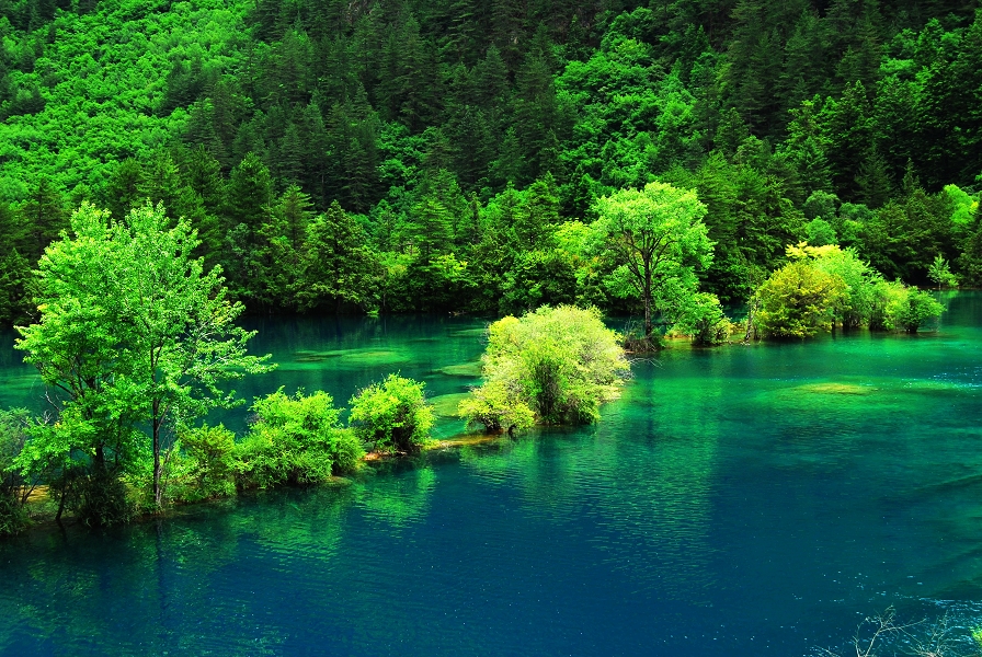 夏:夏日,九寨溝掩映在蒼翠欲滴的濃蔭之中,五色的海,流水梳理著