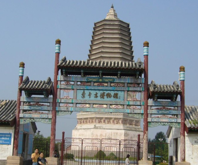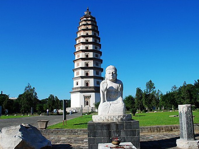 這座八角十三級密檐式磚塔,高80.22米,塔基底徑48.6米,塔體直徑34米,在現存遼塔中雄居魁首。據元一統志載可能建于遼重熙四年(公元1036年)。塔身赤面有兩行蒙文,內容是:“大清咸豐甲寅年敬修”,為清代補修所寫。
