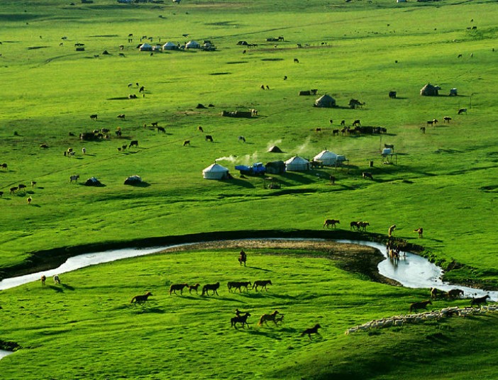 這里是觀賞自然草原風光的勝地。茫茫草原上鮮花綠草,藍藍的天空上飄浮著白云,漫散的牛羊在游蕩,河水在靜靜的流淌……人類與大自然默默相融。這就是貢格爾草原之美。