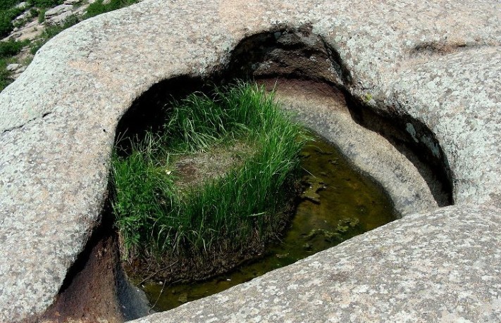 青山自然保護(hù)區(qū)位于海拔1574米的青山山體上,在山頂頂峰分布著各種各樣的冰臼,其平面上多數(shù)呈圓形、近圓形、橢圓形和不規(guī)則的形狀。有的象葫蘆,有的象梅花,有的象瓜子。一般冰臼口稍小,中下部較大,底多較平或呈鍋底微凹。形體“似臼”、“似盤”、“似盆”、“似匙”等,可以說應(yīng)有盡有。其中較深的冰臼多呈口小、肚大和底平特征。口部上緣帶有缺口(或開口),缺口有大有小,有深有淺。一般臼口寬約0.3~2米,深0.1~2米左右。最大的直徑達(dá)10.5米,深4.5米;最小的只有幾公分,似一般鈕扣大小。據(jù)調(diào)查統(tǒng)計(jì),在方圓不到2平方公里的范圍內(nèi),就有大小不一的冰臼1000多個(gè)。有的冰臼光潔如洗,無任何殘留物和充填物,但很多冰臼中,都填滿風(fēng)塵黃土物質(zhì),已長(zhǎng)滿花、草或喬木、灌木,形成大小不同的“天然盆景”,置于堅(jiān)硬平坦的花崗巖山脊上,十分壯觀,給人極大的神奇感和奧秘感。