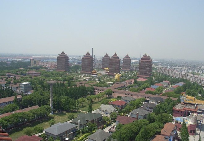 走進(jìn)華西村,遠(yuǎn)遠(yuǎn)就能看見由9座高樓組成的建筑群,是塔不像塔,說樓不是樓。它比普通的塔要高大得多,比普通的樓頂要尖,頂端還豎立著金色的葫蘆。準(zhǔn)確地說,這些樓叫做“塔形樓”或者“塔狀樓”。塔群里每座樓都有獨(dú)特的功能設(shè)計(jì),有的是集團(tuán)辦公樓,有的是賓館、培訓(xùn)中心、營養(yǎng)配餐中心。