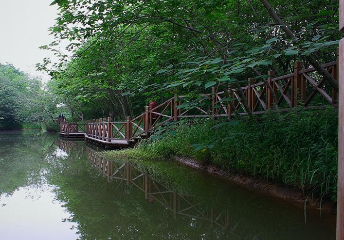 進入景區(qū)大門映入眼簾的是一座傍依古運河畔仿樹樁造型的曲橋,橋長百米,橋曲形美,橋韻古樸。每當(dāng)夏季來臨,滿塘荷葉圓如蓋,清香四溢,花燦如霞。在曲橋的魚池中,放養(yǎng)著數(shù)萬條日本錦鯉和其它觀賞金魚,大的體寬如碗口,水光晃漾,令人陶醉。