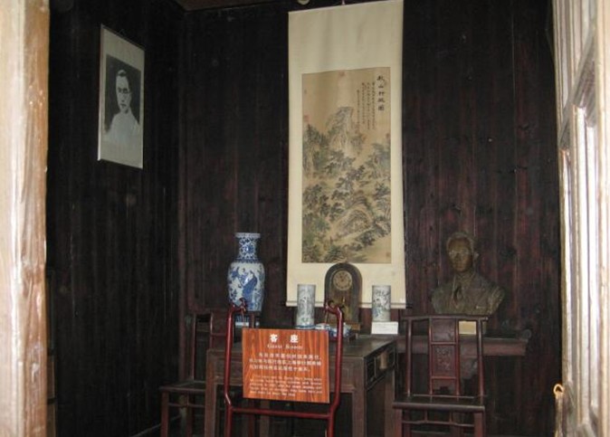 這些清代木椅、案幾、八仙桌等都是當年朱家的日用家具,條案上的座鐘、花瓶、石屏擺件、燭臺和觀音像是老揚州居民家中普遍的陳設。寓意“終生平安”。墻上的“開張天岸馬,奇逸人中龍”的對聯為清代康有為所撰,山水畫是康熙年間著名畫家王原祁作品。使朱家處處留存著傳承書香。 東廂房的兩張大床、梳妝臺、案幾、大櫥、桌子及其它陳設,都是當年朱自清的父母和兩個女兒的所用之物。墻上的兩張照片一張是朱自清的母親,另一張就是《背影》里的那個慈愛的讓朱自清的“眼淚很快流下來”的父親——朱鴻鈞。