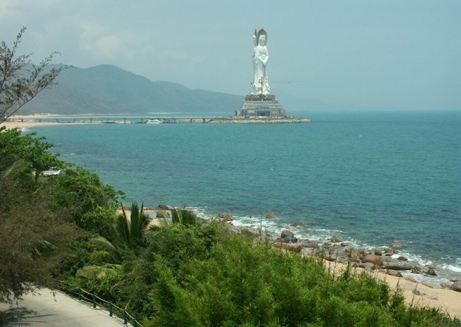 1993年中國國務院宗教局和海南人民政府批準興建南山寺,并在寺前的海中塑108米高之觀音圣像。此像由海南三亞南海海上觀音功德基金會發心敬建,三尊化一體,巍峨壯觀,實乃世界造像之最。敬造工程因其規模宏偉、意義殊勝、佛理底蘊豐富,被譽為“世界級、世紀級”的佛事工程。中國佛教協會趙樸初會長欣然為圣像題名——“南海海上觀音”。