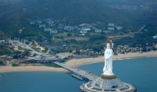 三亞南山海上觀音圣像敬造工程因其規模宏偉、意義殊勝、佛理底蘊豐富,被譽為“世界級、世紀級”的佛事工程。像體為正觀音的一體化三尊造型,寶相莊嚴,腳踏一百零八瓣蓮花寶座,蓮花座下為金剛臺,金剛臺內是面積達15000平方米的圓通寶殿。金剛洲由長280米的普濟橋與陸岸相連,并與面積達60000平方米的觀音廣場及廣場兩側主題公園,共同組成占地面積近30萬平方米的“觀音凈苑”景區。