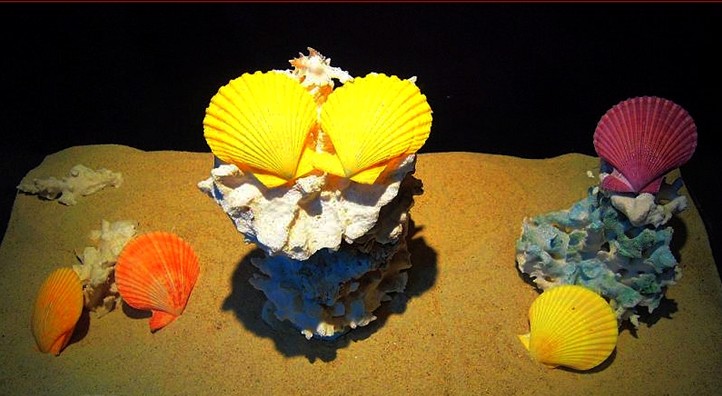 走進貝殼展廳,仿佛走進夢幻般的海底世界。曲徑通幽的貝殼展廳以藍色為設計主調,四壁墻面除陳列貝殼展品用的櫥窗外均漫畫式的畫滿各種海藻、水草和海洋生物。地面墻角用鵝卵石和沙子堆積,然后用珊瑚、貝殼、海星、海龜等標本點綴,營造出一種神奇的海底景觀。展廳四周的櫥窗內陳列了300多種來自世界海洋最具代表性的貝殼,有展翅欲飛的“天使之翼海鷗蛤”、潔白如玉的“白鉛螺”、金光燦燦的“黃金寶貝”、色彩絢麗的“澳洲海扇蛤” 、形似眼睛的“貓眼蠑螺”、還有著名的活化石“紅翁絨螺”和“鸚鵡螺”…… ,這些形形色色、千姿百態的貝殼在燈光的映襯下就是一件件來自海洋深處的藝術珍品,讓游人在觀賞之后不僅驚嘆大自然鬼斧神工,同時激發他們熱愛大自然、保護海洋的情感。