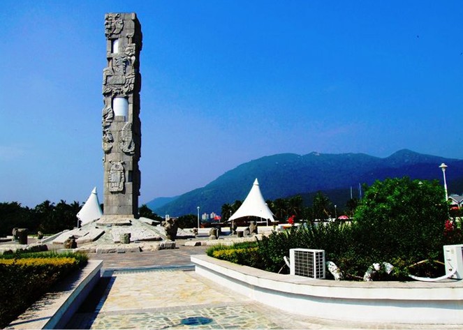 亞龍灣中心廣場,位于三亞市東南28公里處。廣場以圖騰柱向藍天升騰,以雕塑群向大地和大海延伸,其宏偉氣勢和獨特的藝術造型,以有限的藝術空間形式,引導我們的想象向無限的空間擴展。屹立的圖騰柱是廣場的最高點,高26.8米,由200多塊巨大的花崗石和直徑2.5米的鋁合金柱組成。上面雕刻有龍、鳳、太陽鳥、魚以及風雨雷電四神的圖案。 圍繞圖騰柱的中心雕塑區,形成三圈石硨,氣勢宏大、形象獨特:第一圈有蒼龍、白虎、朱雀、玄武四季標識與日晷24節氣雕塑;第二圈表現盤古開天地、女媧補天、嫦娥奔月、弄天舞干戚、大禹治水、牛郎織女、后羿射日、夸父追日等八個遠古神話;第三圈反映天文、人、動物、植物萬物生靈及八位中國古代之神。圖騰柱和雕塑群渾然一體,構成強烈的中國古天文意識和東方神秘色彩。廣場外圍設計的五組白色風帆式的尖頂帳篷及大型彩色噴泉,給具有古老文化意蘊的雕塑增添了現代氣息。