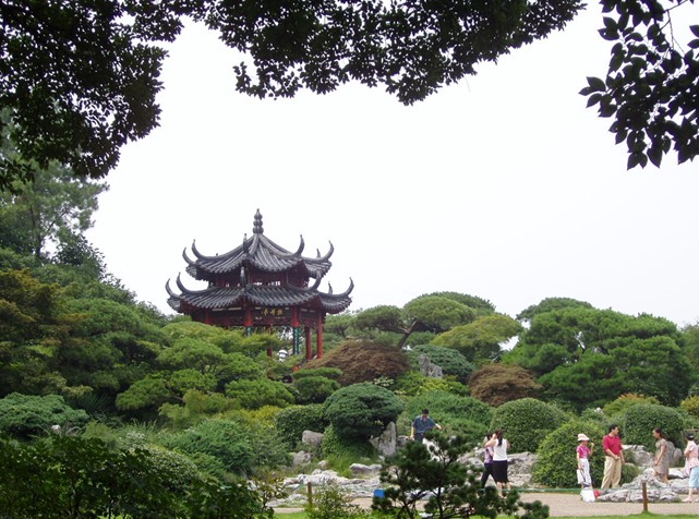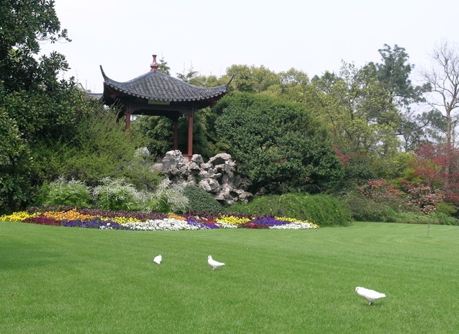 牡丹園西行,山回路轉(zhuǎn)就是密林區(qū),從位置上來(lái)講,它們都位于公園的西部。密林區(qū)得用原來(lái)的土丘,種植常綠闊葉的叢林,并結(jié)合地形,修建林間小道,環(huán)境寧?kù)o,宜于休息,更是凈慈寺僧侶們每晚散步的最佳去處。 自牡丹亭中眺望,公園東、南、北三面景色盡收眼底。