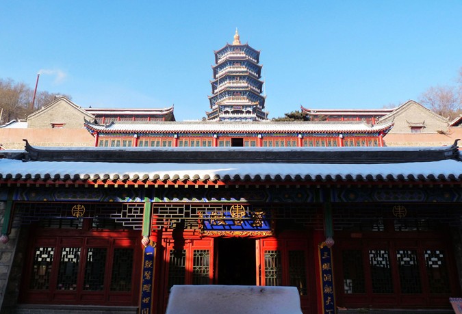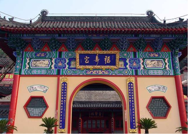第一層為山門,建有馬殿。青石臺基,“福壽宮”匾額高懸。殿內有彩塑紅白二馬,經左右青龍白虎兩個配門踏甬道進入二層大殿。左右鐘鼓二樓。正殿關岳殿,正中關公神像,前供岳飛神位。殿內東為龍王神像,西為財神。版權所有山東聊城聊之旅國際旅行社有限公司,轉載必究!東配殿為兩仙堂,內供紀仙、柳仙。大殿東西各有配房五間,東為講經堂,西為大仙堂。第三層為三座大殿。中為碧霞宮,東殿為呂祖殿,西殿為大仙堂。第四層東西二大殿,東殿為三宮殿,西殿為娘娘殿。最頂一層為三清殿。