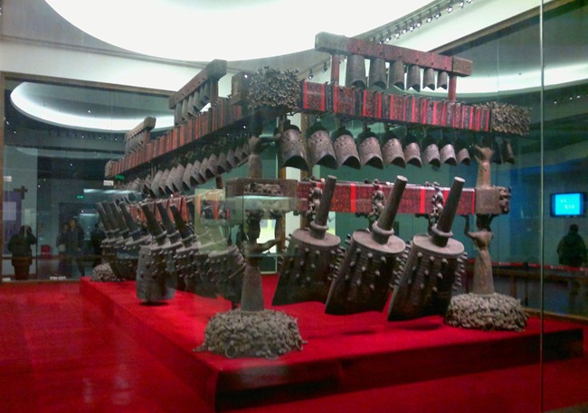 曾侯乙編鐘:時(shí)期為戰(zhàn)國時(shí)期,1978年湖北隨縣曾侯乙墓出土。鐘架長(zhǎng)748厘米,高265厘米,重4.5噸左右。全套編鐘共六十五件,分三層,八組懸掛在呈曲尺形的銅木結(jié)構(gòu)鐘架上。每件鐘均能奏出呈三度音階的雙音,全套鐘十二個(gè)半音齊奏,可以旋宮轉(zhuǎn)調(diào)。音階為現(xiàn)今通用的C大調(diào),能演奏五聲、六聲或七聲音階樂曲。