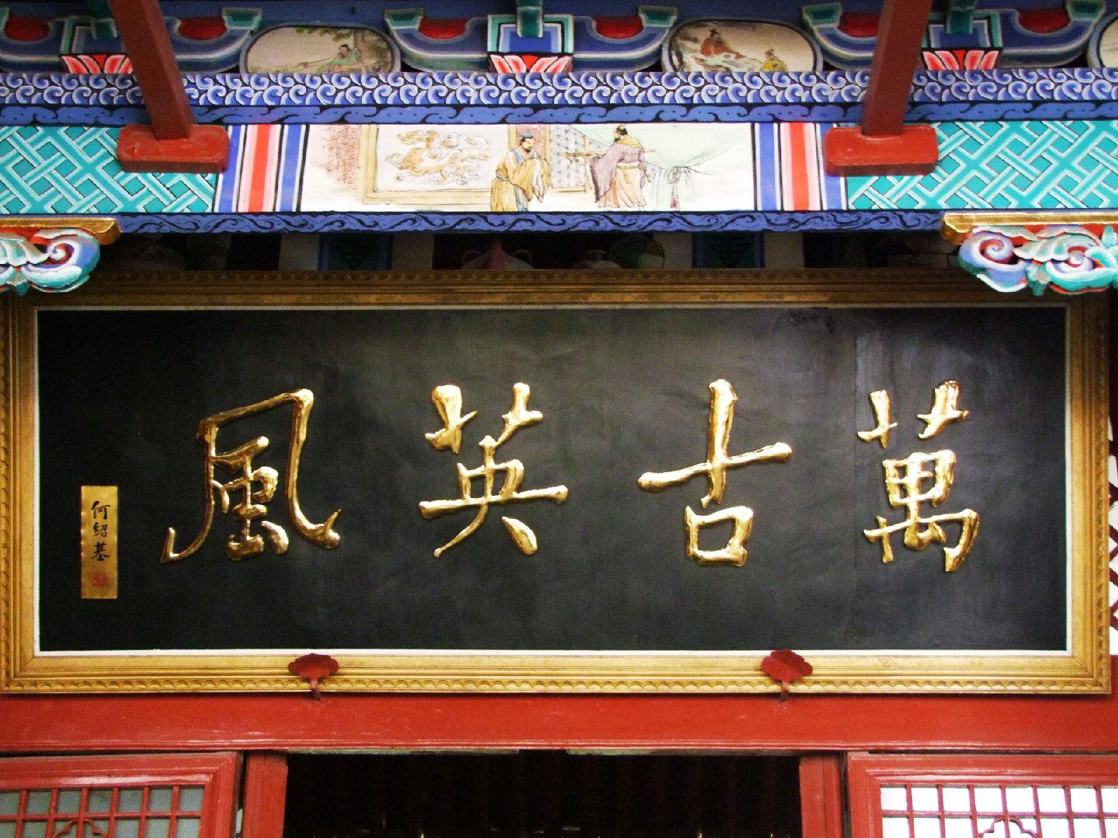 照壁的背后是他書寫的“忠、義、仁、勇”四個大字,成為會館一景,不少游人在此駐足留影紀念。