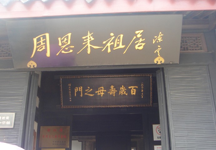周恩來(lái)祖居,在浙江省紹興市區(qū)保佑橋河沿即今勞動(dòng)路東首,是一幢坐北朝南具有明代建筑風(fēng)格的磚瓦房,富有傳統(tǒng)特色的黑色竹絲臺(tái)門(mén)。祖居外觀古樸莊嚴(yán),共三進(jìn),每進(jìn)三間房。兩進(jìn)之間各有天井相隔,天井兩側(cè)有小廊對(duì)拱。第一進(jìn)中間為臺(tái)斗門(mén),左右為耳房。第二進(jìn)為大廳。第三進(jìn)原為樓房,倒塌后,改建平房。現(xiàn)為浙江省愛(ài)國(guó)主義教育基地、紹興市學(xué)校德育基地。