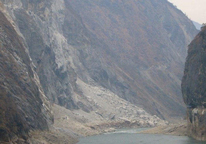 3.如去中虎跳,路上可讓司機在上虎跳找個相對安全的地方停車看一下。路況很差,山上都是風化石,一陣風刮過就撲撲的往下掉,很多路段都路基下沉。