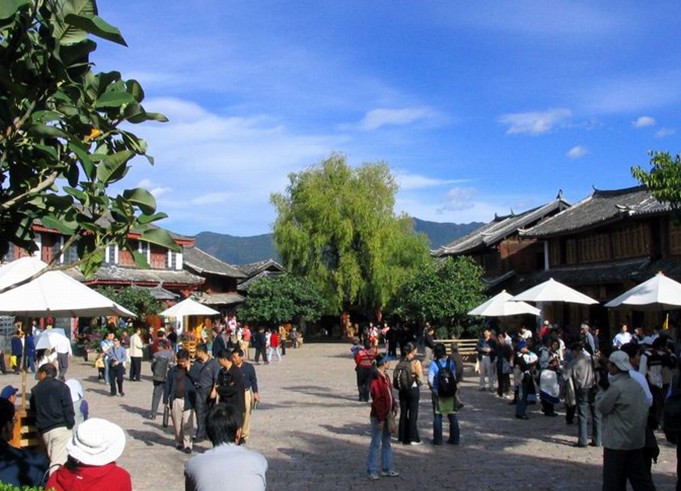 四方街是麗江古城心臟,交通四通八達,周圍小巷通幽,據說是明代木氏土司按其印璽形狀而建。這里是茶馬古道上最重要的樞紐站。明清以來各方商賈云集,各民族文化在這里交匯生息,是麗江經濟文化交流的中心。這里是歷代集市中心,每日萬頭躦動,熱鬧非常。從四方街四角延伸出四大主街,直通東南西北四郊,又從主街岔出眾多街巷,如蛛網交錯,往來暢通。街道全用五彩石鋪砌,平坦潔凈,晴不揚塵,雨不積水。幾乎每條街道一側都伴有潺潺流水。由此形成以四方街為中心,四周店鋪客棧環繞,沿街逐層外延的稠密而又開放的格局,古老的集市就這樣孕育了城市最初的形狀,這與中國傳統的四四方方的井字形街道是不是一樣的。