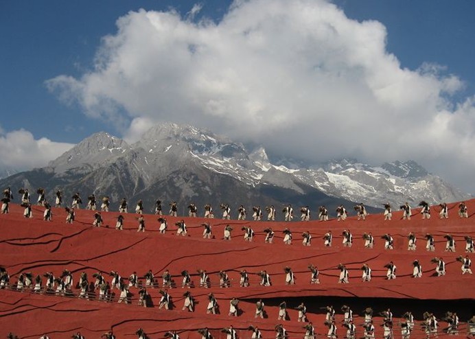 來自10個少數民族的鏗鏘漢子,來自16個鄉下村莊的普通農民,500多個有著黝黑皮膚的非專業演員,用他們原生的動作,用他們質樸的歌聲,用他們滾燙的汗水,與天地共舞,與自然同聲,帶給你心靈的震撼?!队∠?bull;雪山》大型實景演出克服了白天演出的諸多弊端,在經過近百次的修改之后,終于將白天的劣勢轉為優勢,讓每一個身臨其境的觀者都能真實地感受到一種從未體驗過的情感。演出全長1個小時,啟用了先進的造水工程和煙霧效果工程,與自然交相輝映,營造出令人贊嘆的視覺效果。