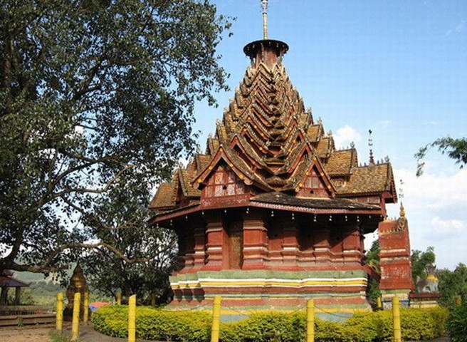 西雙版納景真八角亭為磚木結(jié)構(gòu),呈八角形,亭身有31個(gè)斜面,鑲嵌彩色玻璃,并用金銀粉印出各種花卉、動(dòng)物、人物圖案,在陽光的照射下,光彩奪目。